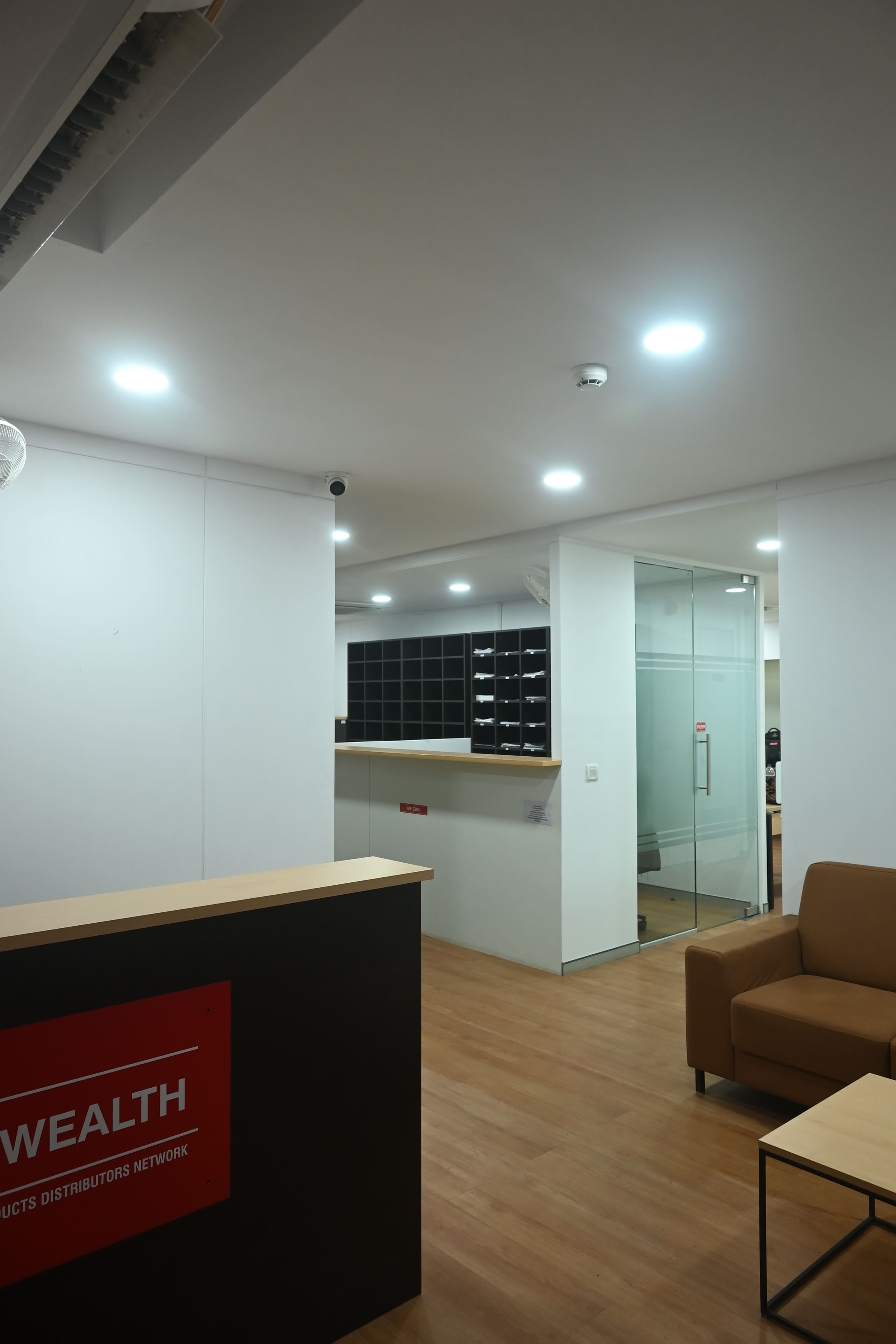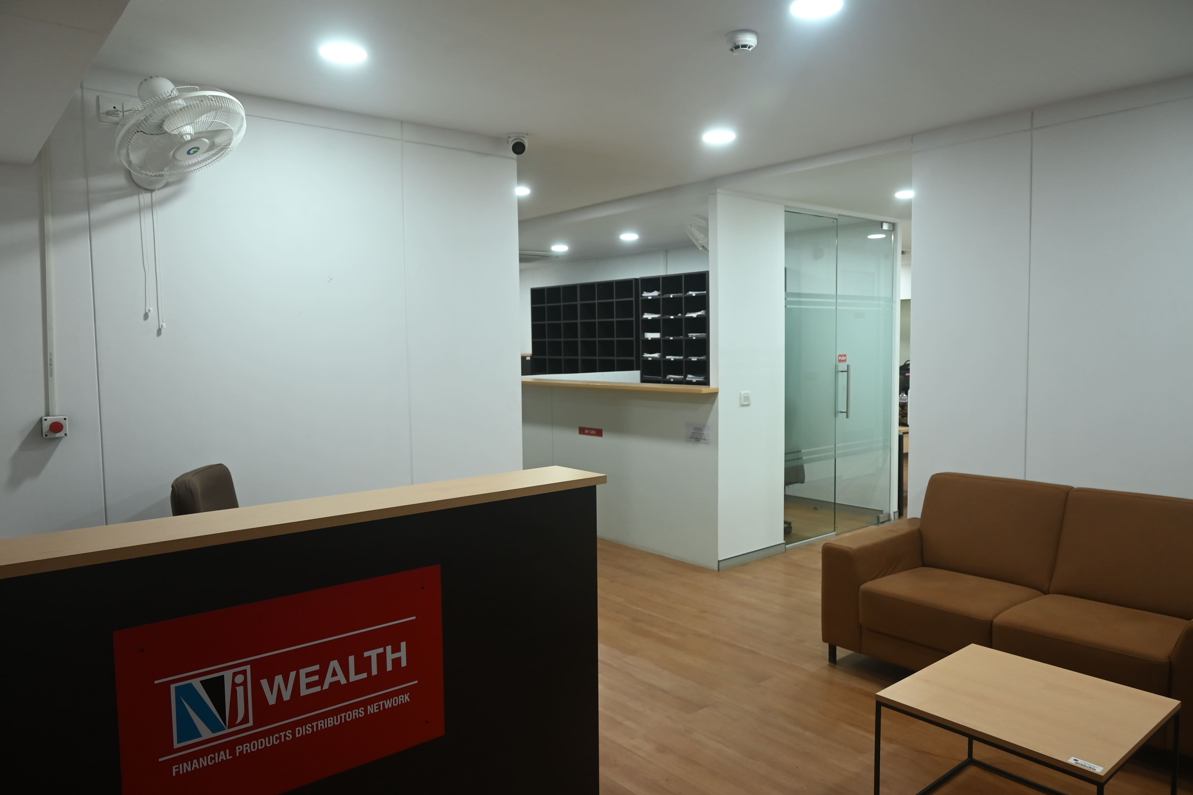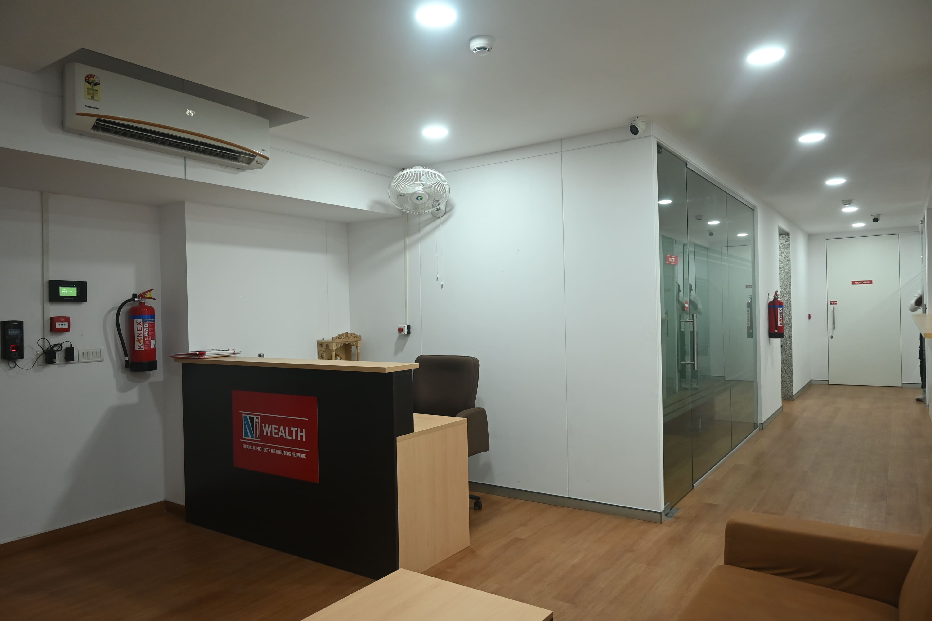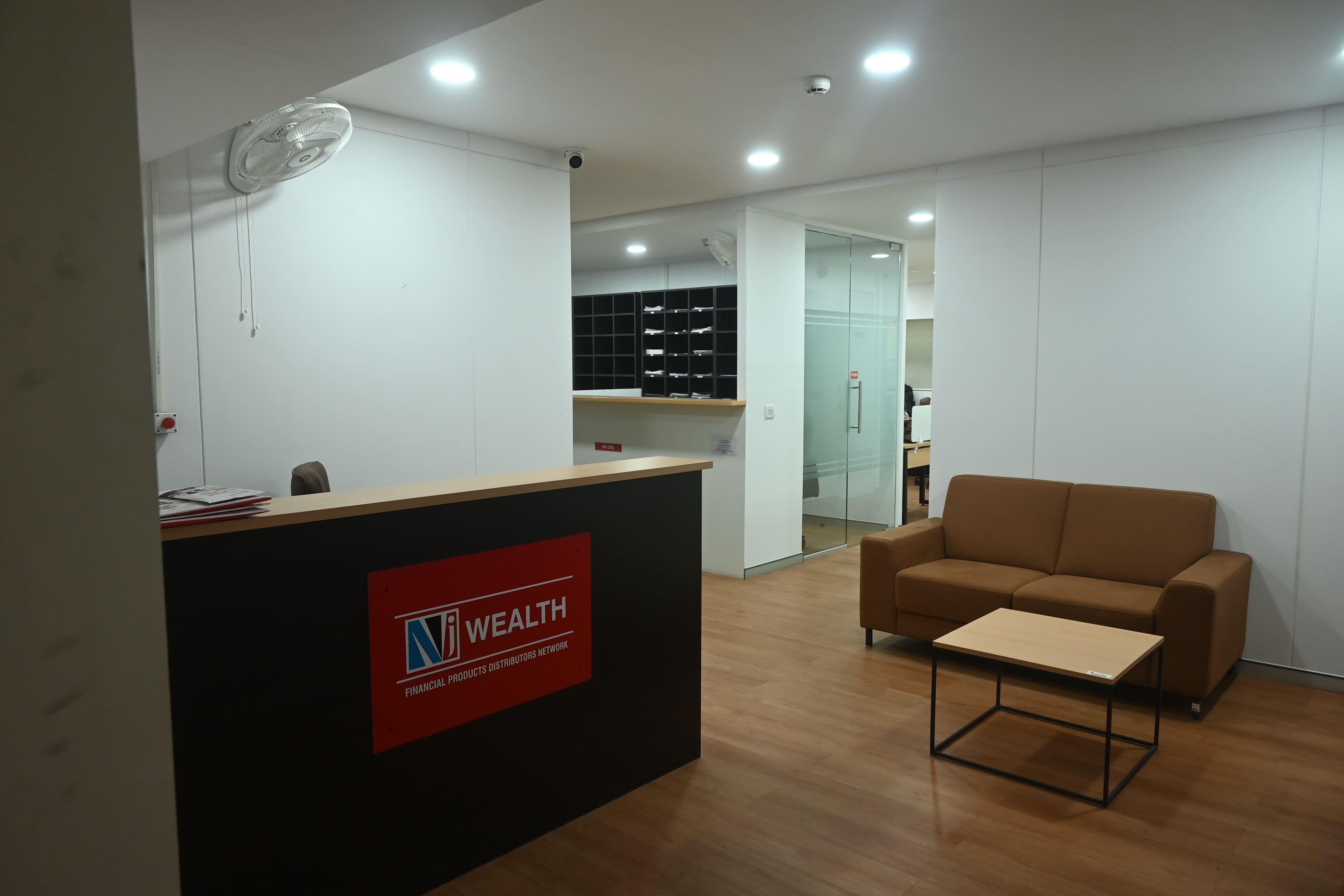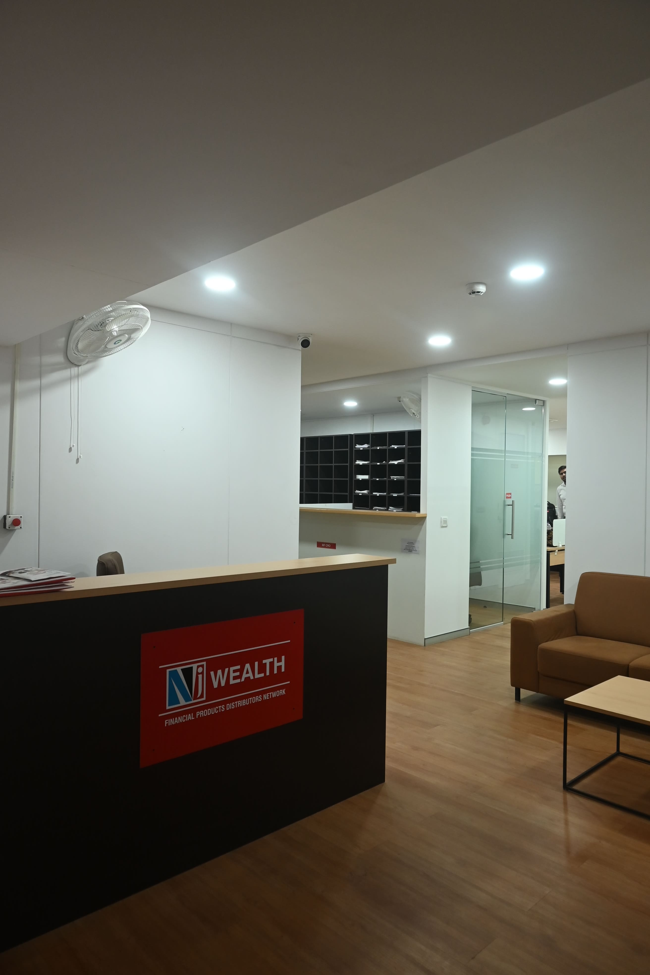 Vivid Decor designed a sleek and functional workspace for NJ Wealth’s Vapi office, focused on boosting productivity, collaboration, and brand identity. The interiors showcase ergonomic workstations, executive cabins, premium meeting rooms, and vibrant breakout areas, all customized to foster a dynamic corporate atmosphere.